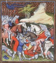 | Keywords: Charles de Blois is taken prisoner.jpg en Jean Froissart Chroniques Vol I Charles de Blois is taken prisoner Place of origin date Paris Virgil Master illuminator ; c 1410 Material Vellum ff 382 385x288 243x187 mm 42 lines littera cursiva Binding 18th-century brown leather; gilt; with coat of arms of Stadholder William V Decoration 1 two-column miniature 170x180 mm ; 29 column miniatures 115/65x95/80 mm ; 1 historiated initial 45x50 mm ; decorated initials with border decoration ff 1r 24r 36r 62r 74v etc Provenance Louis de Luxemburg conn štable de France d 1475; signature erased ; by descent to his granddaughter Françoise de Luxembourg and her husband Philip of Cleves d 1528; coat of arms with label over erasure; signature ; purchased in 1531 from Philip's estate by HenriIII Count of Nassau d 1538 ; by descent to the Princes of Orange-Nassau the later Stadholders at The Hague; carried off in 1795 to Paris by the French and restituted to the Koninklijke Bibliotheek in 1816 http //www kb nl/manuscripts/show/manuscript/72+A+25 Jean Froissart Chroniques Vol I Virgil Master illuminator ca 1410 Chroniques de Froissart vol 1 - Den Haag KB 72 A 25 c 1410 PD-old-100 Charles of Brittany Battle of La Roche-Derrien Medieval miniatures of battles Hundred Years' War |