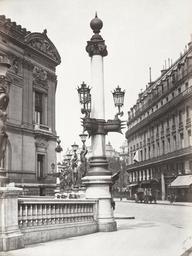 | Keywords: Charles Marville, Opéra colonne rostrale, 1878.jpg Photograph en Marble column mounted on stone base holding wrought iron brackets for lamps in the shape of ships' prows globe surmounts capital of pillar Base of pillar incorporates stone balustrade on left classical style statues of women supporting lanterns on heads visible on balustrade behind lamp post depicted people depicted place 1878 photographic print mounted on cardboard albumen silver 35 5 x 26 5 cm accession number H2011 78/55 SLVIC-digitalimage 109393 H2011 78/55 Title on contents page Colonne rostrale Opéra Institution State Library of Victoria object history exhibition history credit line Gift; Government of France; 1881 Information field In collection Ville de Paris Collection des appareils d'éclairage au gaz établis sur la voie publique PD-100 Rostral columns in Paris Place de l'Opéra Paris Historical images of Opéra Garnier Collection des appareils d'éclairage au gaz établis sur la voie publique Images of Paris from the State Library of Victoria |