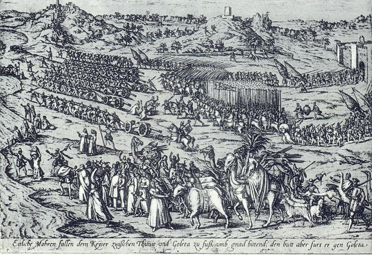 | Keywords: Charles quint a rades.png Charles Quint se rendant à Radès illustration de Jan Cornelisz Vermeyen Charles Quint sortant de Tunis à la tête de ses troupes pour se rendre à Radès استقرار شارل الخامس برادس عام 1535 م Estampe d'aprés un dessin de Vermeyen 1535 Creator Jan Cornelisz Vermeyen PD-old-100 Charles V Holy Roman Emperor in engravings Conquest of Tunis 1535 Jan Cornelisz Vermeyen | ||||