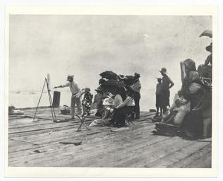 | Keywords: smithsonian institution smithsonianinstitution artist painting boats dockside audience cape cod school of art capecodschoolofart born 1872 in maine born1872inmaine died 1930 died1930 portrait painter portraitpainter charles hawthorne sketching charleshawthornesketching class watching professor classwatchingprofessor etching class etchingclass painter dock. artist dockartist outdoors onlookers umb historical photo historicalphoto seaside pier archives of american art archivesofamericanart photo border Description: Hawthorne sketching with his class looking on. Hawthorne, Charles Webster, 1870 or 1872-1930 or 1932 Creator/Photographer: Unidentified photographer Medium: Black and white photographic print Dimensions: 21 cm x 26 cm Date: c. 1910 Persistent URL: www.aaa.si.edu/collections/images/detail/charles-webster-... Repository: Archives of American Art Collection: Charles Webster and Marion Campbell Hawthorne papers, 1870-1983 Accession number: aaa_hawtchar_5064 Description: Hawthorne sketching with his class looking on. Hawthorne, Charles Webster, 1870 or 1872-1930 or 1932 Creator/Photographer: Unidentified photographer Medium: Black and white photographic print Dimensions: 21 cm x 26 cm Date: c. 1910 Persistent URL: www.aaa.si.edu/collections/images/detail/charles-webster-... Repository: Archives of American Art Collection: Charles Webster and Marion Campbell Hawthorne papers, 1870-1983 Accession number: aaa_hawtchar_5064 |