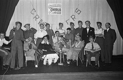 <b>Nodyn/Note:</b> Image shows Charlie Chester and the "Craziliers" concert party. Charlie was stationed in Newtown afer Dunkirk, and he started an army concert party which performed in such places as the Regent Cinema. The members of the party included Ronnie Moss, Don Mumford, Charlie Murray, Les Blandford, Jim Murphy, Len Swanton, Len Martin, Don McQuillan, Cyril Evans, John Poppy and Charlie Chester (at the microphone). Also present is Georgie Black, Regent Cinema Manager.