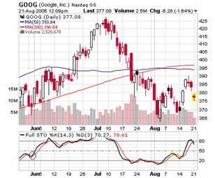 | Keywords: Chart Goog.png Chart de la acción bursatil de la empresa Google cotizada en Nasdaq En su parte inferior presenta el gráfico del Oscilador Estocástico señalando con azul cuando corta su media movil en forma ascendente y con amarillo cuando lo hace en forma descendente 2006-08-21 own assumed Booksboy Google Technical analysis Share price trends |