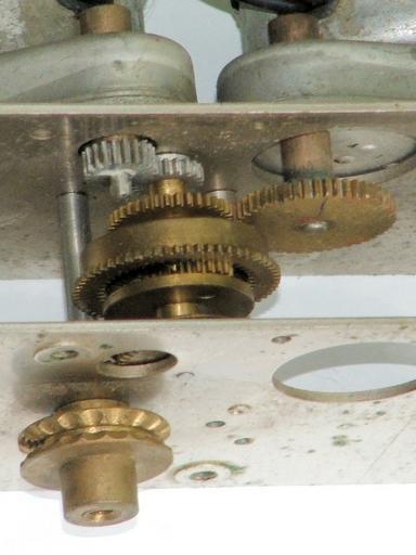 | Keywords: ChartDriveDetail.JPG  chart recorder One synchronous motor drives the annular gear of an epicyclic differential while the other drives the Sun and planet gear sun gear The output shaft driven by the plate holding the pivots for the Sun and planet gear planet gears turns at one of 3 different speeds depending on the combination of motors currently running The mechanism was made by Cramer Controls Corp no earlier than 1961 The outside diameter of the drum supporting the annular gear of the differential is 0 95 inches 54 mm 2014-05-25 16 52 13 own Douglas W Jones cc-zero Uploaded with UploadWizard Differentials Chart recorders Location not applicable |