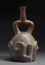 | Keywords: ChavĂn - Feline-and-Cactus Stirrup Vessel - Walters 482832 - Back.jpg This Tembladera-style Chavín work depicts a feline rendered in relatively high relief alternating with a cactus form that may refer to the hallucinogenic San Pedro cactus Chavín is considered the mother civilization of the South-American Andes and is often compared to the Olmec of Mexico in that both cultures established many patterns of art architecture and culture by 1000 BC that prevailed until the arrival of Europeans in the 16th century Stirrup-spout vessels like this example were made by the Chavín and many other South-American peoples using a number of molds with details modeled by hand Although we do not know what was stored in these vessels suggestions include corn beer or chicha a native Andean fermented beverage Chavín stirrup-spout vessels vary in both their architecture spout-width shape direction and type of decoration Many combine incised design with modeled form as in this example Felines of the type depicted on this vessel were important in Chavín art and culture because they were associated with the ruling houses In nature such animals are often excellent hunters who occupy the top of the food chain qualities also valued in human rulers Felines like jaguars and pumas were also thought to enjoy great spiritual force; shamans were believed to transform into such creatures between 900 200 BC Early Horizon-Early Intermediate ceramic grayware cm 29 85 17 15 accession number 48 2832 79372 Mr Alexis Forrester London before the late 1970s mode of acquisition unknown Economos Works of Art Santa Fe New Mexico date and mode of acquisition unknown Private collection 1991 by purchase Walters Art Museum Anonymous gift 2009 place of origin Peru Walters Art Museum license Chavin art in the Walters Art Museum Sculptures of cats |