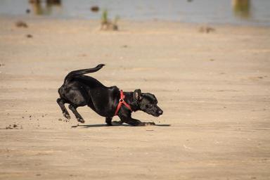 Keywords: cheerful dog runs puppy beach animal fun jogging joy pond doggy and the tramp