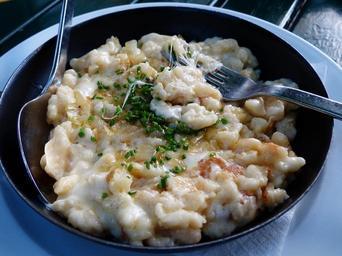 Keywords: cheese noodles eat court substantial tasty spicy cheese spätzle main course beer garden food pan fry up chives spoon fork