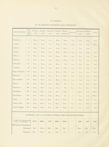 | Keywords: Chemisch-physiologische Untersuchung der characteristischeren Tabaksorten Ungarns (Page 38) BHL21362272.jpg Chemisch-physiologische Untersuchung der characteristischeren Tabaksorten Ungarns Im Auftrage der Kön Ungarischen Naturwissenschaftlichen Gesellschaft bearb von Dr Thomas Kosutány Aus dem Ungarischen im Auszug übers 21362272 69542 27128 Page 38 Text Table http //www biodiversitylibrary org/page/21362272 10 5962/bhl title 27128 Kosutány Tamás NOT_IN_COPYRIGHT<br> Biodiversity Heritage Library Check categories 2015 October 28 PD-old-70-1923 Chemisch-physiologische Untersuchung der characteristischeren Tabaksorten Ungarns Images uploaded by Fæ Files from the Biodiversity Heritage Library |