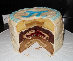 Keywords: Cherpumple1.jpg en Cherpumple yellow cake with pumpkin pie chocolate cake with cherry pie and spice cake with apple pie own Liz Abersold 2015-03-14 Desserts Pies Cakes Pi Day food Cc-zero