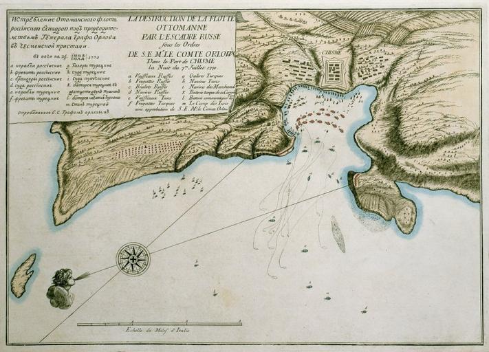 Keywords: Chesmabattle plan.jpg en This is map of destroing Tukish navy in Chesma bay by russian navy count Orlov at night 6/7 july 1770 ru План ист ебления ту ецкого флота в Чесменской бухте оссийской эскад ой под п едводительством г афа Алексея О лова в ночь с 25 на 26 июня с 6 на 7 июля 1770 года de Inhaltliche Beschreibung Seeschlacht bei Cesme zwischen Russen und Osmanen 1770 nach Südosten ausgerichteter Plan mit der Stadt und Hafeneinfahrt mit Schlachtverlauf mit Legende in russischer und französischer Sprache fr Originaltitel Plan General de la victoire remportée sur le Turcs par la Flotte de S M I de toutes les Russies sous les Ordres de S E Mr le comte Orlow General Commandant etc le 5m Juillet 1770 http //www digam net/dokument php ID 4455 author 1771 PD-old-100 Maps of the Russo-Turkish Wars