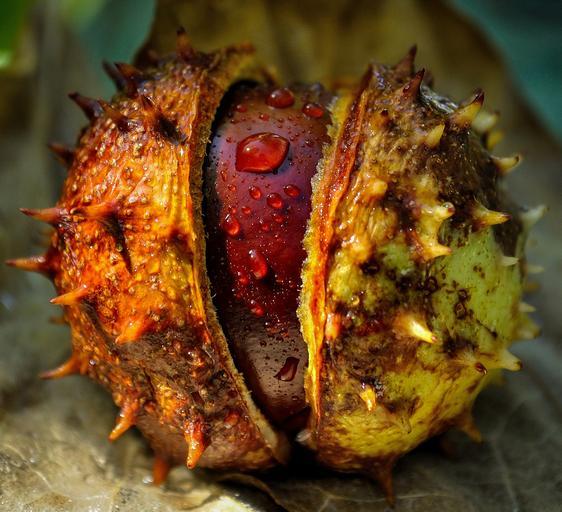 Keywords: chestnut autumn fall nature plant closeup raindrops seed brown