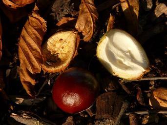 Keywords: chestnut buckeye fruit concerns ground collect autumn fruits brown shine toxic forest floor earth grass moss leaves shell prickly pieksig sleeve