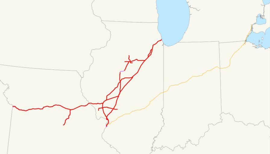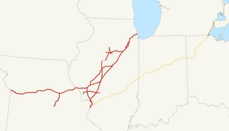 | Keywords: Chicago and Alton Railroad system map (1918).svg This is a map of the Chicago and Alton Railroad drawn on the Toledo St Louis and Western Railroad Clover Leaf system as of 1918 with trackage rights in purple Email me if you would like a copy of the GIS data I created modified from Bureau of Transportation Statistics North American Transportation Atlas Data or if you see any errors 2008-11-23 own assumed NE2 System maps of defunct U S railroads Alton Railroad Toledo St Louis and Western Railroad |