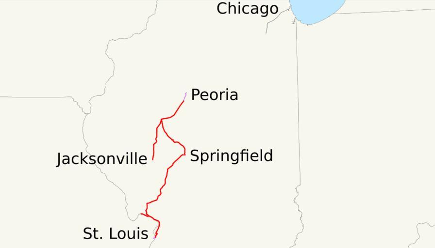 | Keywords: Chicago, Peoria and St. Louis Railroad system map (1918).svg This is a map of the Chicago Peoria and St Louis Railroad as of 1918 with trackage rights in purple Email me if you would like a copy of the GIS data I created modified from Bureau of Transportation Statistics North American Transportation Atlas Data or if you see any errors 1918 in Illinois 1918 in rail transport in the United States System maps of defunct U S railroads Chicago Peoria and St Louis Railroad Rail transport maps of Illinois 2009-01-23 own assumed NE2 |