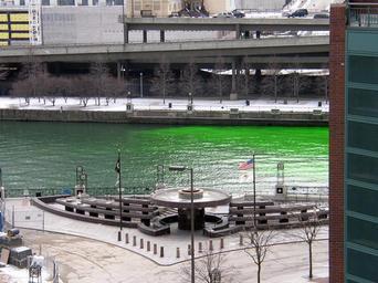 | Keywords: Chicago River, dye travelling upstream.jpg Chicago River In the foreground is Centennial Fountain To the right west the river is being dyed green for the Saint Patrick's Day in Chicago celebration Some of the dye has made its way upstream and into view from the right Across the river the triple-decker Wacker Drive is seen just as the upper and service levels are ending Behind it is a glimpse of the construction at Lakeshore East ;Credits I Knowledge Seeker took this photograph on March 12 2005 It was taken near the intersection of McClurg Court and North Water Street The view faces south Knowledge Seeker Chicago River Water dyed in green for Saint Patrick Saint Patrick's Day in Chicago |