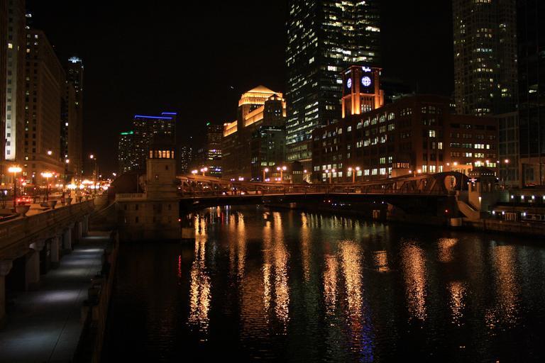 Keywords: chicago river reflections architecture nights lights evening dark water skyline buildings illuminated cityscape urban illinois