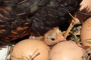 Keywords: chicks yellow freshly hatched head wet plumage lie between the eggs still brooding eggs under the mother hen curious exhausted live protection warm straw