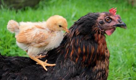Keywords: chicks yellow mother hen hen chick on the back of the hen cute spring sweet fluffy curious chicken plumage poultry creature animals meadow out