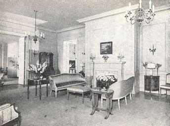 | Keywords: cmr embassy usa eeuu uruguay indoor (1946) The walls of the living room, like the rest of the residence, are painted in a pearl gray. Luis XVI chairs in clear walnut, ivory-colored Adam sofas and love seats. On the rear wall: a cabinet painted in a deep red lacquer, decorated with Chinese engravings. Above the elegant fireplace is a landscape by Cordet. Completing the arrangement are chandeliers and a beige rug. The residence of the U.S. Ambassador to Uruguay was completed and officially inaugurated in September, 1942. (1946) El living-room, como toda la residencia, muestra paredes pintadas en gris perla mate. Sillones Luis XVI, de nogal claro, sofaes, gemelos Adam, de haya patinados de marfil. En la pared del fondo un gabinete de laca rojo oscuro, decorado con dibujos chinos. Sobre la elegante chimenea clásica un paisaje atribuído a Carot. Completa la ornamentación, arañas y apliques holandeses de bronce y alfombra lisa color beige. La residencia del Embajador de los Estados Unidos en Uruguay se completó y fue oficialmente inaugurada en setiembre de 1942. [Photo: Editorial Anales S.A. (1946)] (1946) The walls of the living room, like the rest of the residence, are painted in a pearl gray. Luis XVI chairs in clear walnut, ivory-colored Adam sofas and love seats. On the rear wall: a cabinet painted in a deep red lacquer, decorated with Chinese engravings. Above the elegant fireplace is a landscape by Cordet. Completing the arrangement are chandeliers and a beige rug. The residence of the U.S. Ambassador to Uruguay was completed and officially inaugurated in September, 1942. (1946) El living-room, como toda la residencia, muestra paredes pintadas en gris perla mate. Sillones Luis XVI, de nogal claro, sofaes, gemelos Adam, de haya patinados de marfil. En la pared del fondo un gabinete de laca rojo oscuro, decorado con dibujos chinos. Sobre la elegante chimenea clásica un paisaje atribuído a Carot. Completa la ornamentación, arañas y apliques holandeses de bronce y alfombra lisa color beige. La residencia del Embajador de los Estados Unidos en Uruguay se completó y fue oficialmente inaugurada en setiembre de 1942. [Photo: Editorial Anales S.A. (1946)] |