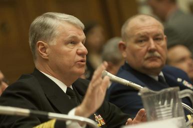 | Keywords: Chief of Naval Operations 071213-N-FI224-190.jpg en Commandant of the Marine Corps Gen James T Conway Chief of Naval Operations CNO Adm Gary Roughead and Commandant of the Coast Guard Adm Thad W Allen appear before the House Armed Services Committee to give testimony and answer questions concerning the unified maritime strategy The strategy The Cooperative Maritime Strategy for 21st Century Seapower seeks to use the assets of all three of the nations maritime services to achieve a balance of peacetime engagement and major combat operation capabilities to include forward presence deterrence sea control power projection maritime security and human assistance and disaster response U S Navy photo by Mass Communication Specialist 1st Class Tiffini M Jones Released <br>Unit Defense Imagery Management Operations Center 2007-12-13 Tiffini Vanderwyst Jones https //www dvidshub net/image/824694/chief-naval-operations 071213-N-FI224-190 2013-02-01 06 40 ARLINGTON VA US PD-USGov-Military-Navy Photographs by Defense Video and Imagery Distribution System Gary Roughead in 2007 James T Conway in 2007 Images from DoD uploaded by Fæ |