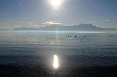 Keywords: chiemsee back light sun sunbeam water horizon mountains line mirroring waters sky blue lake mood peaceful distant view atmosphere