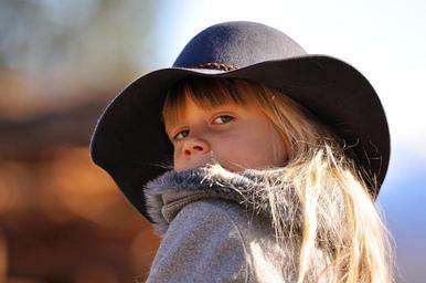 Keywords: child girl blond face hat view crafty torn survive