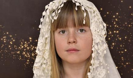 Keywords: child girl blond face headscarf glitter
