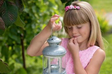 Keywords: child girl blond lantern out nature green pink face