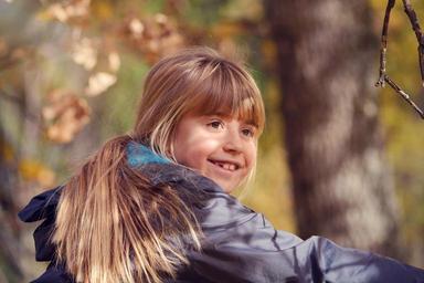 Keywords: child girl blond long hair autumn nature trees happy laugh