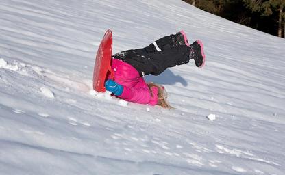 Keywords: child girl bob ride on downhill down slip somersault in motion in action winter snow out nature