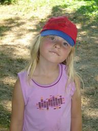 Keywords: child girl cap plate cap summer blond face tooth happy cheeky interested awakened teasingly curious