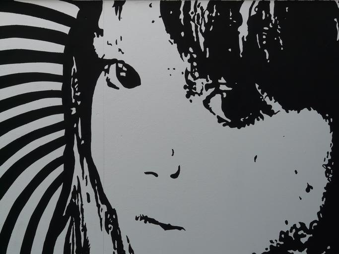 Keywords: child girl face portrait close black and white eyes mouth nose expression mimic