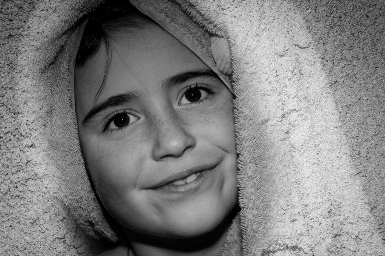 Keywords: child girl face smile portrait close towel black and white recording