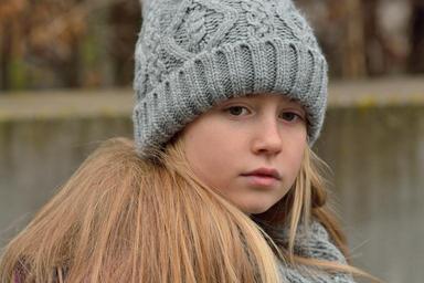 Keywords: child girl long hair blond cap sad thoughtful distressed grieves tribulation
