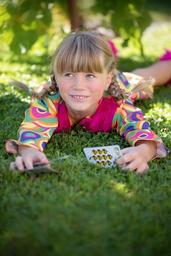 Keywords: child girl play out summer cards playing cards nature meadow grass colorful blond face childhood person human portrait close