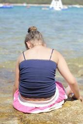 Keywords: child girl sorry sea blue water seating kid outdoors back view