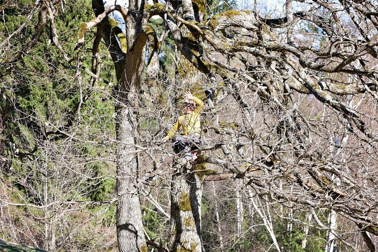 Keywords: child girl tree climbing tree climb nature play out spring bare tree