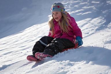 Keywords: child girl winter snow sunshine good weather nature out fresh air bob ride on slip downhill fun winter fun in motion in action joy