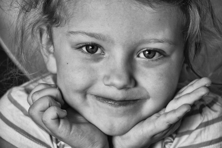 Keywords: child smile portrait happy fun love puppy girl daughter black and white to