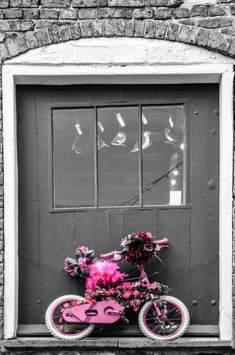 Keywords: children bike bicycle small door flowers pink sport art old abandoned game