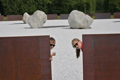 Keywords: children playing boy girl hiding wall stone