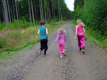 Keywords: children run running girls dirt road road forest