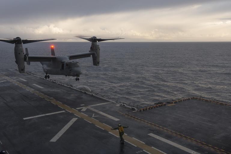 | Keywords: Chilean distinguished visitors land aboard USS America 140824-N-MD297-028.jpg en A tilt-rotor MV-22 Osprey assigned to the Argonauts of Marine Operational Test and Evaluation Squadron VMX 22 transporting distinguished visitors from Chile prepares to land aboard future amphibious assault USS America LHA 6 as part of a bilateral engagement America is currently traveling through the US Southern Command and U S 4th Fleet area of responsibility on her maiden transit America visits the Americas America is the first ship of its class replacing the Tarawa-class of amphibious assault ships As the next generation big-deck amphibious assault ship America is optimized for aviation capable of supporting current and future aircraft such as the Osprey and F-35B Joint Strike Fighter The ship is scheduled to be ceremoniously commissioned Oct 11 in San Francisco U S Navy photo by Mass Communication Specialist 3rd Class Huey D Younger Jr /Released 2014-08-24 Petty Officer 3rd Class Huey Younger https //www dvidshub net/image/1521986 140824-N-MD297-028 2014-08-26 01 18 PACIFIC OCEAN USPACOM AT SEA PD-USGov-Military-Navy MV-22B Osprey USS America LHA-6 Images from DoD uploaded by Fæ |