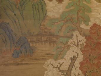 | Keywords: Chinese - Autumn Landscape in Blue-and-Green Style - Walters 353 - Detail B.jpg Two sages cross a bridge In the distance are an elaborate pavilion and a tall waterfall partially shrouded in mist The artist purposefully created an antique-looking painting making use of the ancient blue-and-green style and incorporating the tall mountain peaks of the monumental landscape tradition He also wanted the forms to have a structure-that may look to many of us like a combination of interesting abstract patterns century 17 ink and color on silk mounted on paper L 88 1/8 x W 40 7/8 in 223 8 x 103 8 cm accession number 35 3 14918 Panama-Pacific International Exposition China Pavilion San Francisco 1915 no 5 Henry Walters city Baltimore Walters Art Museum Henry Walters Acquired by Henry Walters 1915 Signature Spurious signature of Zhao Mengfu 1254-1322 ; Inscription lower left; Seal lower left place of origin China Walters Art Museum license 2D Chinese paintings in the Walters Art Museum Media contributed by the Walters Art Museum needs category review Media contributed by the Walters Art Museum needs artist review |
