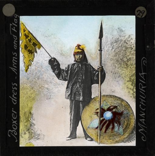 | Keywords: Chinese Boxer - Arms and Flag, Manchuria, ca. 1882-ca. 1936 (imp-cswc-GB-237-CSWC47-LS8-029).jpg  en <br> Chinese Boxer - Arms and Flag Manchuria ca 1882-ca 1936 Boxer dress - Arms and Flag Image of Boxer with a flag spear and a decorative shield The Boxers or the Society of Righteous and Harmonious Fists was a secret society founded in the northern provinces of China The Boxers opposed Western imperialism and Christianity and were responsible for the Boxer rebellion in China between 1898 and 1901 ; This belongs to a series of Church of Scotland Foreign Missions Committee lantern slides relating to the Scottish missionary Dugald Christie Dugald Christie was born in Glencoe in Scotland and studied medicine under the auspices of the Edinburgh Medical Missionary Society In 1882 along with his first wife Elizabeth he went to Manchuria to work as a medical missionary of the United Presbyterian Church of Scotland He worked initially in Newchang and later moved to the capital of Mukden where he opened Manchuriaas first hospital in 1884 In 1912 he established Mukden Medical College Dugald Christie retired in 1923 and died in Edinburgh in 1936 Photographer Unknown Filename imp-cswc-GB-237-CSWC47-LS8-029 tif Coverage date 1882/1936 Part of collection International Mission Photography Archive ca 1860-ca 1960 Geographic subject region Manchuria Type images Part of subcollection Photographs from the Centre for the Study of World Christianity University of Edinburgh U K ca 1900-ca 1940s Repository name Centre for the Study of World Christianity Archival file impaunpub_Volume7/1691 url Repository address The University of Edinburgh School of Divinity New College Mound Place Edinburgh EH1 2LX United Kingdom Geographic subject country China Format aacr2 1 lantern slide 8 x 8 cm Geographic subject continent Asia Rights Contact the repository for details Part of series Dugald Christie LS8 Repository email divinity-CSWC ed ac uk Subject lcsh Keyword Soldiers; Rites and ceremonies Date created 1882/1936 Publisher of the digital version University of Southern California Libraries Subject aat genre portraits Format aat lantern slides Legacy record ID impa-m69140 Access conditions http //www ed ac uk/schools-departments/divinity/research/centres/world-christianity/collections-resources File GB 237 CSWC47/LS8/29 1882/1936 author http //digitallibrary usc edu/cdm/ref/collection/p15799coll123/id/64810 PD-old-70-1923 Magic lantern images Images from USC Digital Library uploaded by Fæ International Mission Photography Archive ca 1860-ca 1960 |