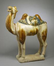 | Keywords: Chinese - Camel - Walters 492383 - Profile.jpg This double-humped camel with tiger-faced saddlebag raises its head and bares its teeth Its maker modeled the figure allowed it to dry then covered it with a thin coat of white clay slip before applying lead silicate glazes of amber cream blue green and brown When the camel was later fired the glazes ran together in the kiln producing a mottled and streaked effect that evidently appealed to the Tang T'ang Chinese Tie-dyed textiles of the period have a similar character This camel like all wares with lead-fluxed glazes was made to be placed in a tomb presumably of an important person century 7 8 Technique sancai glazes earthenware cm 57 47 accession number 49 2383 7363 C K Chang Philadelphia date and mode of acquisition unknown Walters Art Museum 1949 by purchase Museum purchase 1949 place of origin China Walters Art Museum license Chinese ceramics in the Walters Art Museum Tang dynasty sancai camel statues Statues of camels of the Tang Dynasty Media contributed by the Walters Art Museum needs category review |