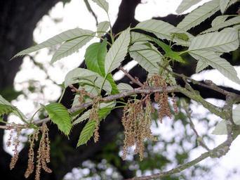 Keywords: Chinese cork oak foliage and flower.jpg Folkiage and flowers of Chinese cork oak Quercus variabilis at Tortworth Court own 2006-05-16 Velela Quercus variabilis