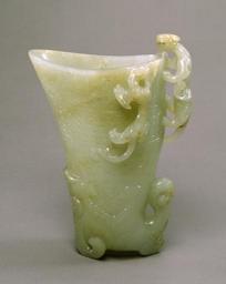 | Keywords: Chinese - Cup with Dragon Handles - Walters 42250 - Profile.jpg This dull green jade rython cup sits on the horns and tail of a monster-mask near its base A tiger headed creature peers over its rim and another with a bird tail lifts its head up to the edge of the rim A third smaller creature climbs up the cup's side The upper portion of the cup presents a band fo incised monster-masks and rui heads century 12 14 nephrite cm 12 2 accession number 42 250 19316 Dr John C Ferguson Collection Sale American Art Association April 7 1916 no 53 Henry Walters city Baltimore Walters Art Museum Henry Walters Acquired by Henry Walters 1916 place of origin China Walters Art Museum license Art of China in the Walters Art Museum Chinese jade 12th-century sculptures Green cups |