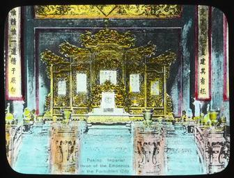 | Keywords: Chinese imperial throne, Beijing, China, ca.1917-1923 (IMP-YDS-RG224-OV1-0000-0005).jpg en <br> Chinese imperial throne Beijing China ca 1917-1923 Imperial throne of the emperors in Forbidden City ; From the lantern slide show of Rolland and Lottie Welch who served under the United Evangelical Mission / Evangelical church in Hunan China from 1917 to 1923 Subject aat general views Photographer Unidentified Filename IMP-YDS-RG224-OV1-0000-0005 Coverage date 1917/1923 Subject unesco Customs and traditions; Buildings Part of collection International Mission Photography Archive ca 1860-ca 1960 Type images Part of subcollection Photographs from the Yale Divinity School Library New Haven Connecticut ca 1880-1950 Repository name Yale University Divinity School Day Missions Library Archival file impa_Volume289/IMP-YDS-RG224-OV1-0000-0005 tiff Geographic subject city or populated place Beijing Repository address Yale University Divinity School Library 409 Prospect Street New Haven CT 06511 Geographic subject country China Geographic subject continent Asia Rights Yale University Divinity School Day Missions Library Part of series Yale Divinity Library Special Collections; Rolland and Lottie Welch Papers Repository email Divinity Library yale edu Date created 1920/1940 Publisher of the digital version University of Southern California Libraries Format aat lantern slides Legacy record ID impa-m66477 Access conditions http //www library yale edu/div/reproductions html File YDS/RG224/OV1/0000/0005 1920/1940 Unidentified http //digitallibrary usc edu/cdm/ref/collection/p15799coll123/id/51531 PD-old-70-1923 Interior of the Palace of Heavenly Purity Forbidden City Images from USC Digital Library uploaded by Fæ International Mission Photography Archive ca 1860-ca 1960 Magic lantern images |