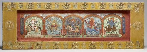 | Keywords: Chinese - Manuscript Cover with Lhamo Flanked by Four Goddesses - Walters 3591.jpg Each figure in this painting is under an elaborate arch with inscriptions in both Mongolian and Chinese At the far right is an inscription in Chinese providing the title of the manuscript Sutra of Ten-Thousand Buddha Names At the far left is a Mongolian inscription The piece is in a wood frame covered with brocade The figures are Palden Lhamo Shri Devi in Sanscrit the protector goddess in the center flanked by left to right Goddess of Spring Goddess of Autumn Goddess of Summer and Goddess of Winter century 18 wash colors on paper mounted on panel in wood frame with brocade H 6 15/16 x L 23 3/4 in 17 7 x 60 4 cm accession number 35 91 29183 Henry Walters Baltimore date and mode of acquisition unknown Walters Art Museum Henry Walters Acquired by Henry Walters Inscriptions At right in Chinese Wang fu ming jing ; Inscriptions At left in Mongolian place of origin Tibet Walters Art Museum license Tibetan art in the Walters Art Museum Buddhist art of Mongolia Media contributed by the Walters Art Museum needs artist review Buddhist deities Palden Lhamo Tibetan painted book covers |