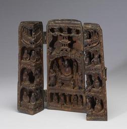 | Keywords: Chinese - Portable Buddhist Shrine - Walters 61266 - Three Quarter.jpg This is a portable shrine of the type that played a role in the transmission of Buddhism from Central Asia to China and from China to Korea and Japan Carved out of a single piece of wood somewhere in China it may have been subsequently carried to Japan Most of the figures can be identified but it is not customary to show them all together The historical Buddha Sakyamuni is shown preaching the Lotus Sutra one of the Mahayana Buddhist texts He is flanked by his chief disciples and by donors Above Buddha from the distant past appears and below an orchestra plays On wings at the top are a pair of Bodhisattvas Manjusri and Samantabhadra Below them are the sixteen disciples of Sakyamuni called arhats the Sanskrit word for a highly realized Buddhist ascetic or lohan in Chinese century 10 12 carved wood Open cm 19 05 20 64 8 26 accession number 61 266 33837 Yamanaka Co New York date and mode of aquisition unknown Henry Walters Baltimore 1920 Walters Art Museum Henry Walters Acquired by Henry Walters 1920 Sticker Y B 1980 Yamanaka Co Pilgrimage and Buddhist Art Asia Society New York 2010 place of origin China Walters Art Museum license Portable Buddhist Shrine - Walters 61266 |